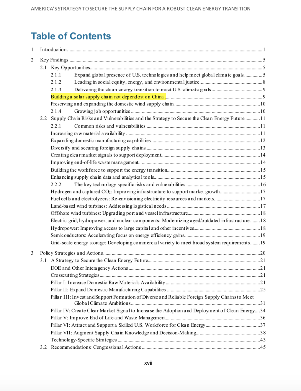 在第14017号行政令一年后,重点执行审查任务的美国能源部、美国交通部、美国农业部、美国医疗与公众服务部、美国商务部、美国国土安全部、美国国防部,分领域给出了补充报告,罗列出具体行动计划,笔者查阅发现,在美国能源局发布的报告中,有这样一个专门的章节——“建立一个不依赖中国的太阳能产业链”,而在美国商务部联合美国国土安全部发布的报告中,“中国”则出现了130余次,针对中国、“去中国化”的意图昭然若揭,关键矿产就是吸引最多“火力”的话题之一。